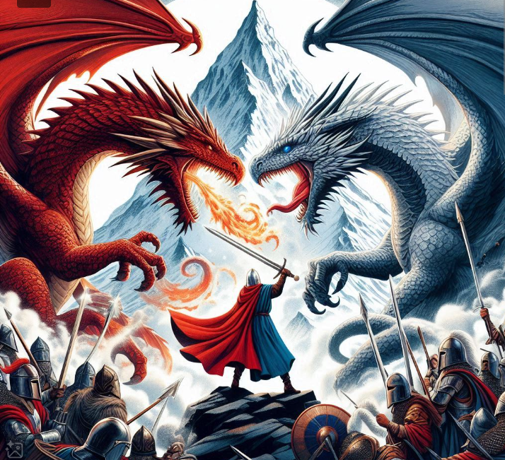 From the gloom came a sound like the rolling of far-off thunder. Then, with a crack of rock, two shapes burst forth , a red dragon, fierce and blazing, and a white dragon, cold and glimmering as ice. They clashed with a force that shook the mountain. Fire met frost, talon met scale, and the roar of their fury rolled across the land.