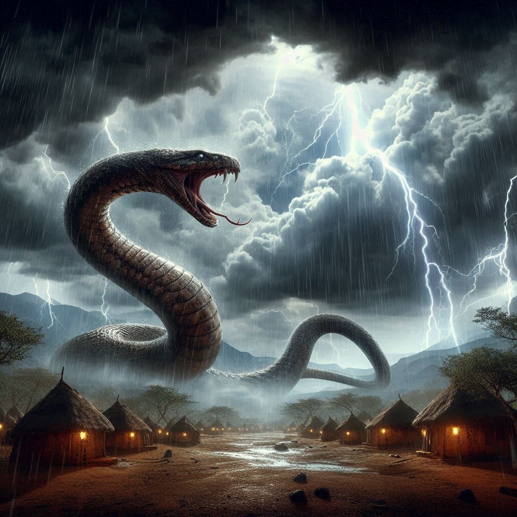 From beyond the clouds, a massive serpent emerged. It was longer than ten rivers and broader than the mountain path. Its body shimmered like storm water, and its eyes burned red like fire in the dark. This was uNomgqomqelo, the Rain Serpent, a creature known only in whispered legends.
